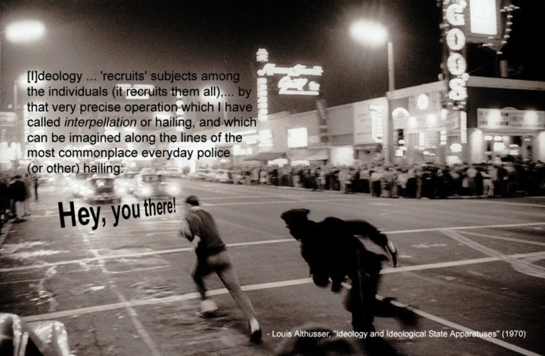 按照他的解释,这种物质存在正体现在对 ** 仪式(包括发生在头脑中的观念的仪式) ** 的规定,意识形态——作为「象征秩序」的同义词——的功能正是 ** 为不同的仪式赋予不同的意义 ** ,而个人通过表演不同的仪式被确定为不同的主体。阿尔都塞举的例子恰恰符合「训唤」的字面意义:一个人走在大街上,警察在这个人的身后叫一声「喂!叫你呢!」这个人如果回过头来,那就是接受了警察的训唤,从而被确认成为一个主体;是意识形态规定了面对警察的呼喊时回过头来这一仪式的代表的意义:一个接受国家暴力机器镇压的主体。