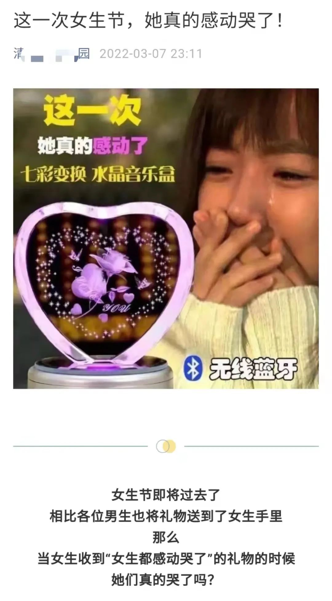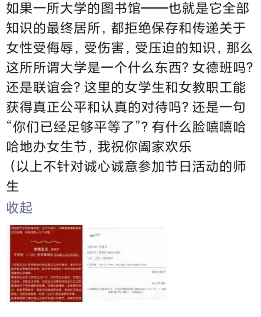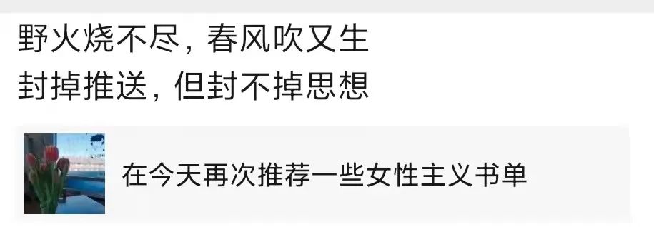 我们也看到了更加进步的声音:有对被删推送的声援,有对性别话题课堂的介绍,有对“女生节”的多角度思考,有对消费陷阱的理智拒绝,还有打破了传统角色的祝福,这些让我们依旧可以相信,在传统与进步、规训与自由的充满张力的角逐中,会有更多看向未来的眼睛。