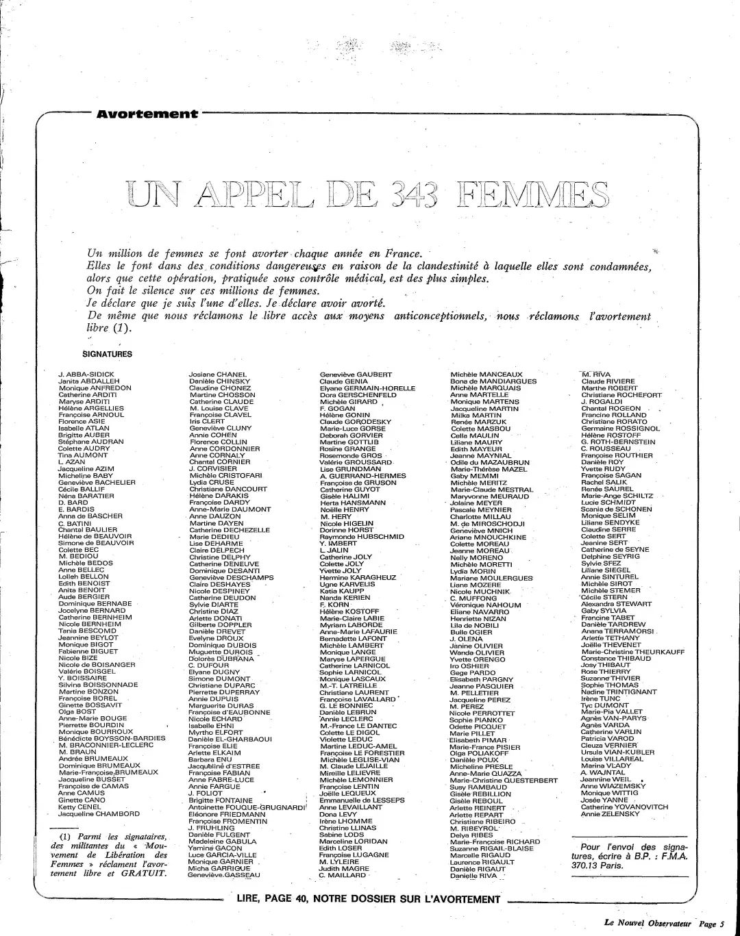 1971年4月5日, 343位法国女性联名在《新观察家》(Nouvel Observateur)杂志上发表了《我们的子宫属于我们自己》(Notre Ventre, Nous Appartient),又称《343宣言》 (Manifeste de 343)。 ** 她们在宣言中公开承认自己曾经堕胎,用宣告自己违法的方式挑战保守的法律和道德。 ** 一经发表,它就引起了巨大的争议。