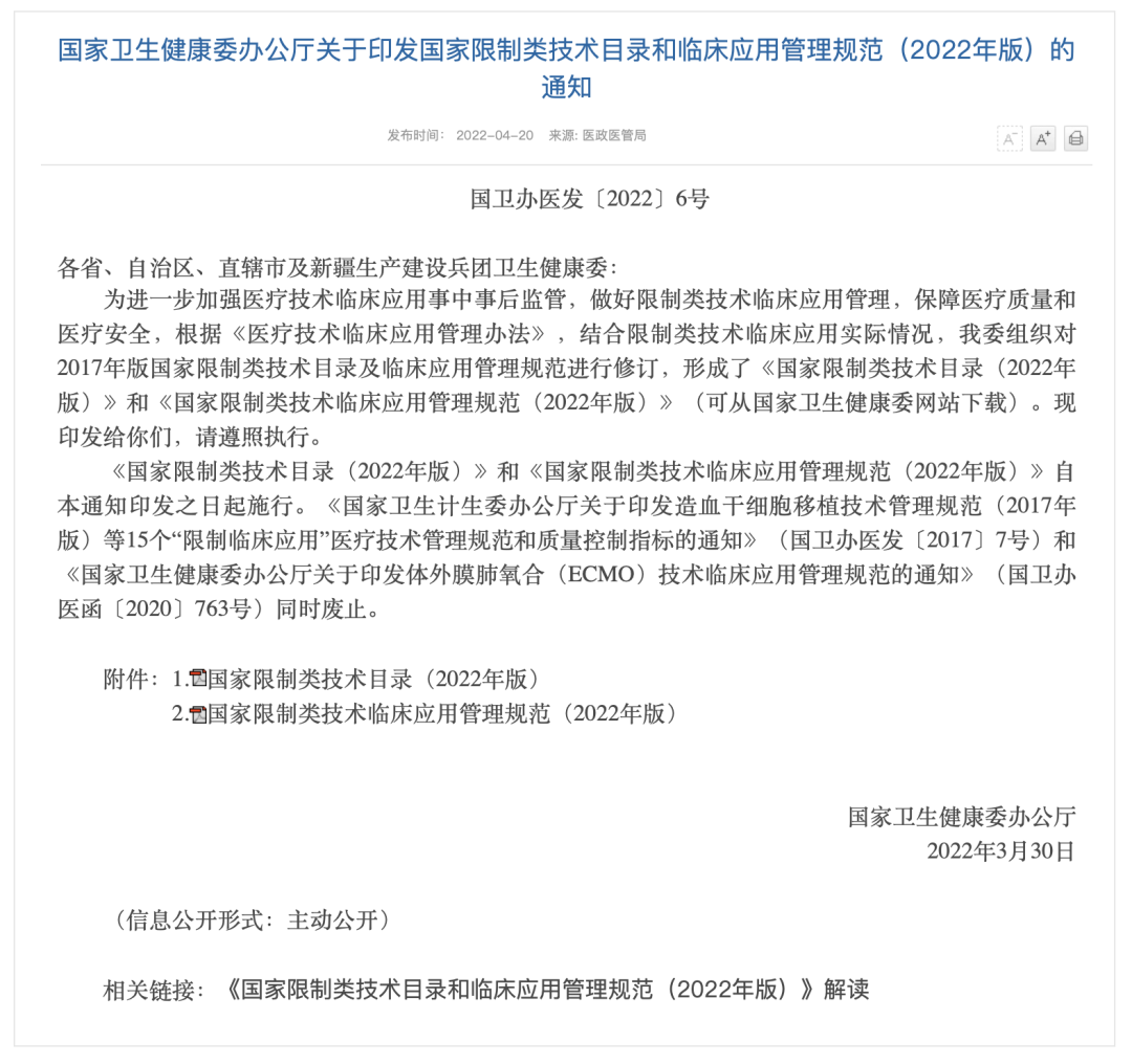 3月30日,国家卫生健康委办公厅发布 《关于印发国家限制类技术目录和临床应用管理规范(2022年版)的通知》 ,并公开了新修订的《国家限制类技术目录(2022年版)》和《国家限制类技术临床应用管理规范(2022年版)》,其中包含对 《G05 性别重置技术临床应用管理规范》 的最新修订。