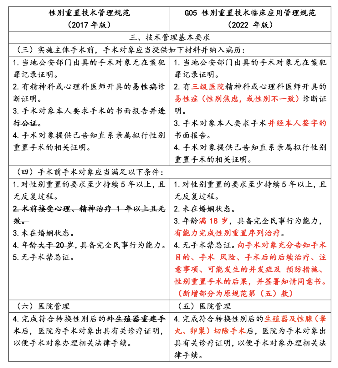 - 手术年龄门槛降低至 18岁 ,并强调有能力完成性别重置序列治疗。