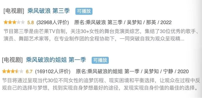 与 逾16万人 评价、豆瓣平台平均分为 6.7 的《乘风破浪的姐姐 第一季》相比,仅有 3万人 评价、豆瓣平台平均分为