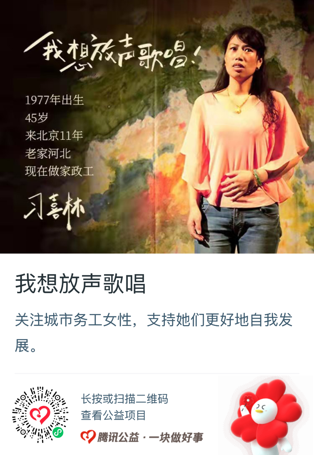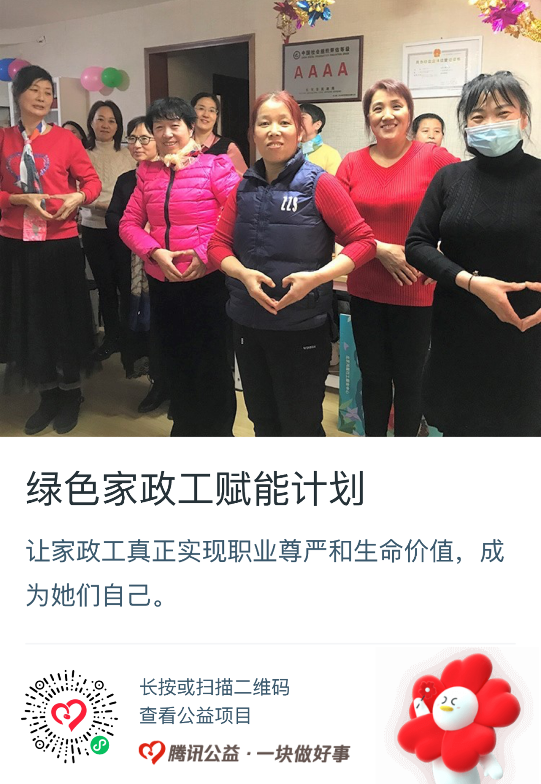 3. 绿色家政工赋能计划 通过 建设活动空间、举办文化活动和展开绿色家政培训 ,让家政工姐妹们实现职业尊严和生命价值 执行机构:北京鸿雁社工服务中心 收款机构:中国乡村发展基金会