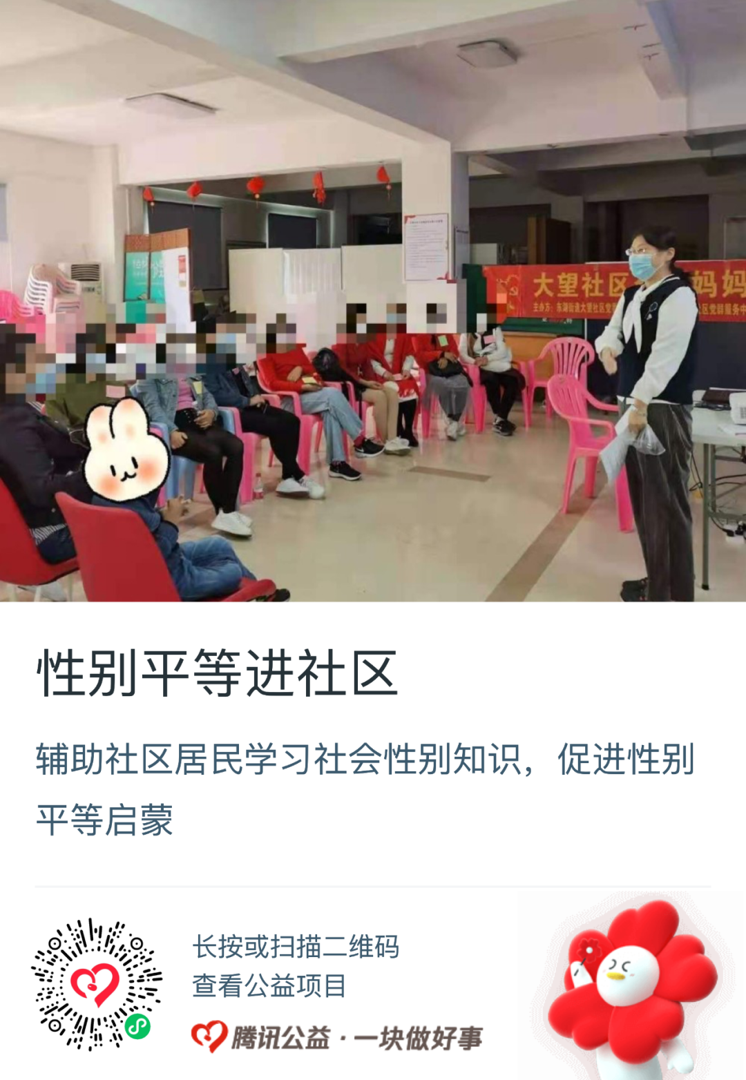 6. 性别平等进社区 辅助社区居民 学习社会性别知识 ,促进 性别平等启蒙 执行机构:深圳市罗湖区半枝莲同城姐妹关爱中心 收款机构:爱德基金会
