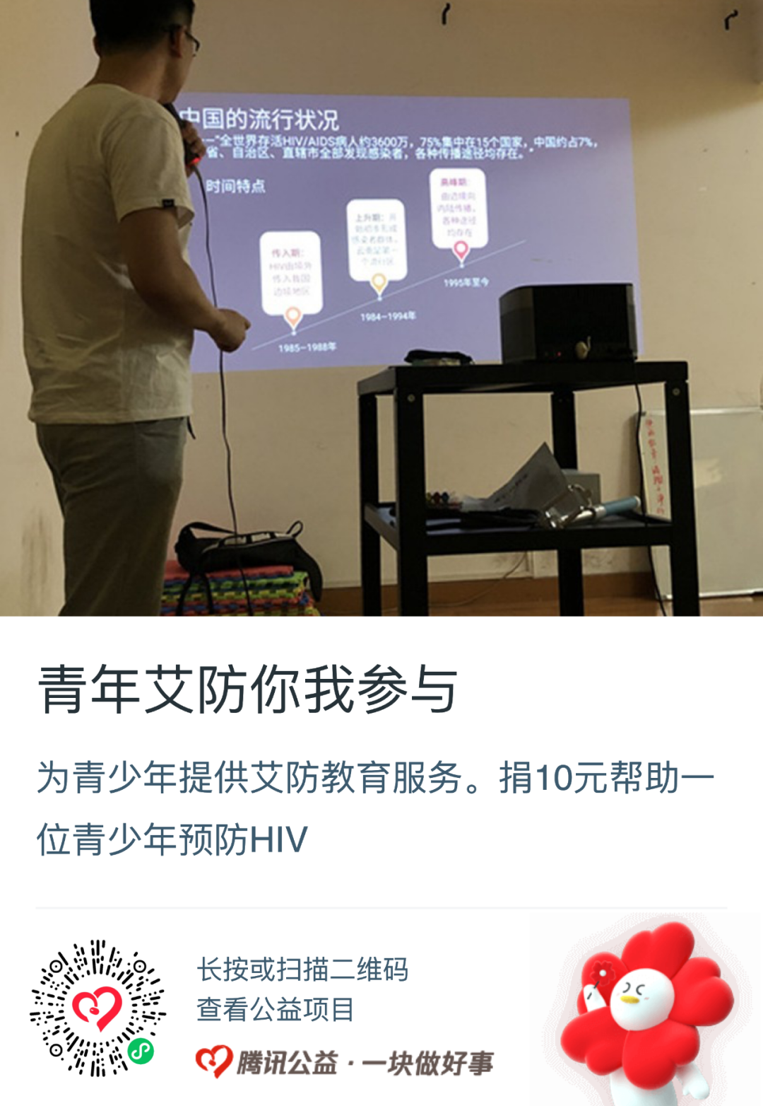 7. 青年艾防你我参与 为较弱势的青少年等人群提供 艾防同伴教育 、 社工支持 ,也为HIV阳性人群提供 公益支持服务 执行机构:广州市越秀区智同公益服务中心 收款机构:爱德基金会