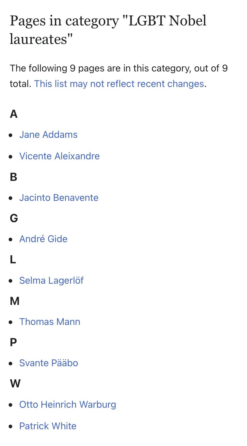 诺贝尔奖创立于1901年,截至2021年,共颁给了962位个人和25个组织。其中性少数获奖者如下(未包括今年的全部获奖者;仅列出了公开性倾向的获奖者)。