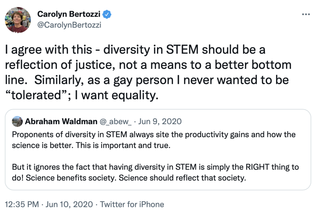 以“性少数”这个非常私人的标签作为科学家身份的前缀,总是让卡罗琳·贝尔托齐感到心里不舒服。她说,这就如同被问及“作为不抽烟的/爱吃辣的/每天洗澡的科学家,你有什么样的经历”一样莫名其妙。 对此,贝尔托齐发过的一条推特来回应: