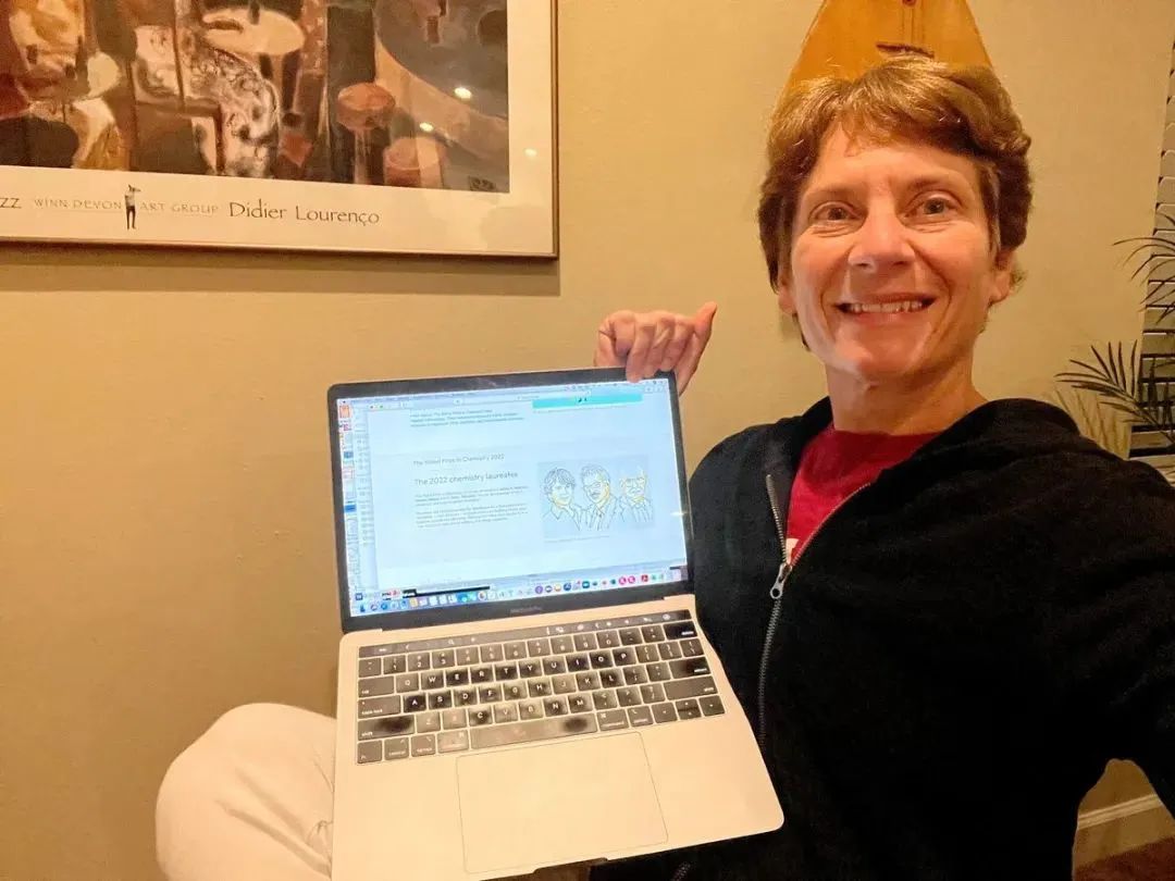 卡洛琳·贝尔托齐于10月5日早上拍摄的一张照片,当时她刚听说自己获得了2022年诺贝尔化学奖