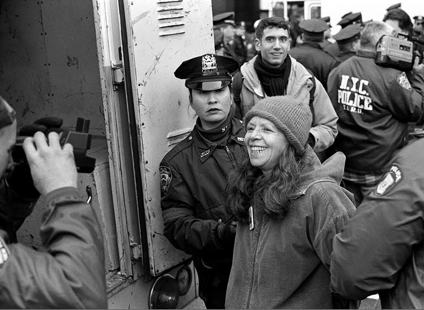 玛克辛·沃尔夫(Maxine Wolfe),据称她最喜欢的事之一就是“因为干好事而被捕”(getting arrested for a good cause),比如图中是她在1997年纽约市的ILGO(爱尔兰男女同性恋组织)抗议活动中笑对被捕。