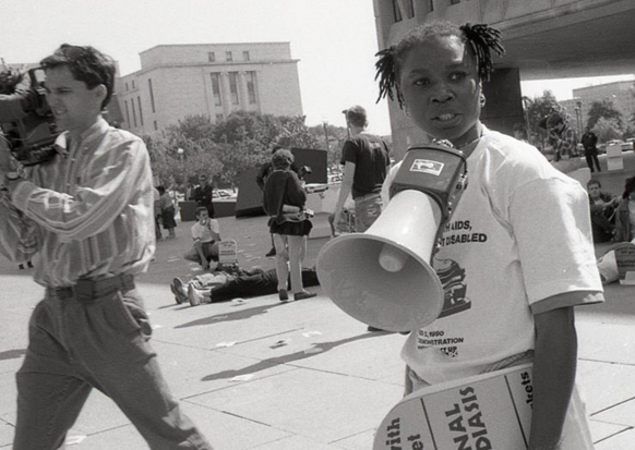 卡特里娜·哈斯利普(Katrina Haslip)在1990年针对美国国立卫生研究院(NIH)的抗议活动中手拿扩音器