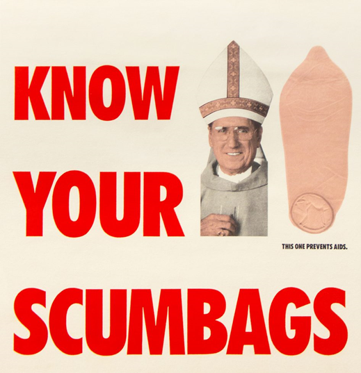 纽约大主教约翰·奥康纳(John O’Connor)的脸旁标着“认认你的人渣(scumbag,也指安全套)”的抗议标志
