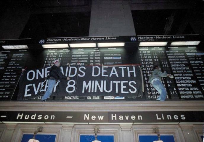 “每8分钟就有一名艾滋病感染者死亡”(One AIDS Death Every 8 Minutes)的横幅高悬于曼哈顿中央车站