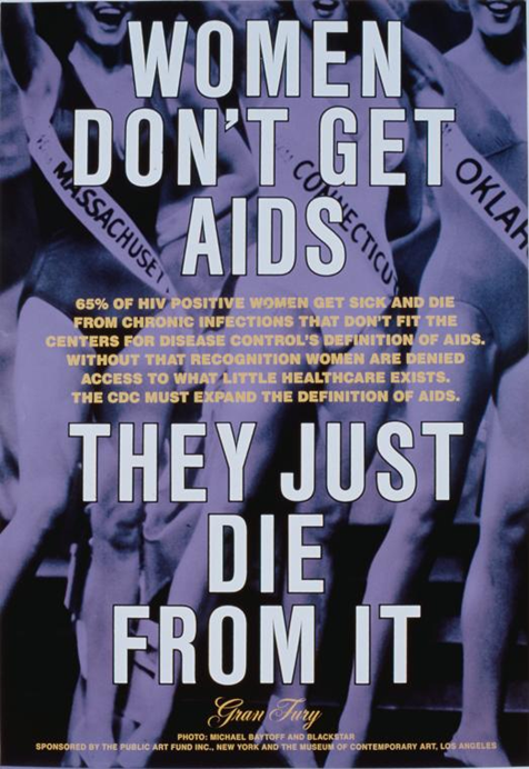 由Gran Fury(致力于通过公共艺术项目解决艾滋病危机的团体)创作的海报,图中黄字为: 65%的HIV阳性女性死于不符合CDC对艾滋病定义的慢性感染 。如果不承认这一点,这些女性甚至没法获得现有的那一丁点医疗保健服务。CDC必须扩大对艾滋病的定义。