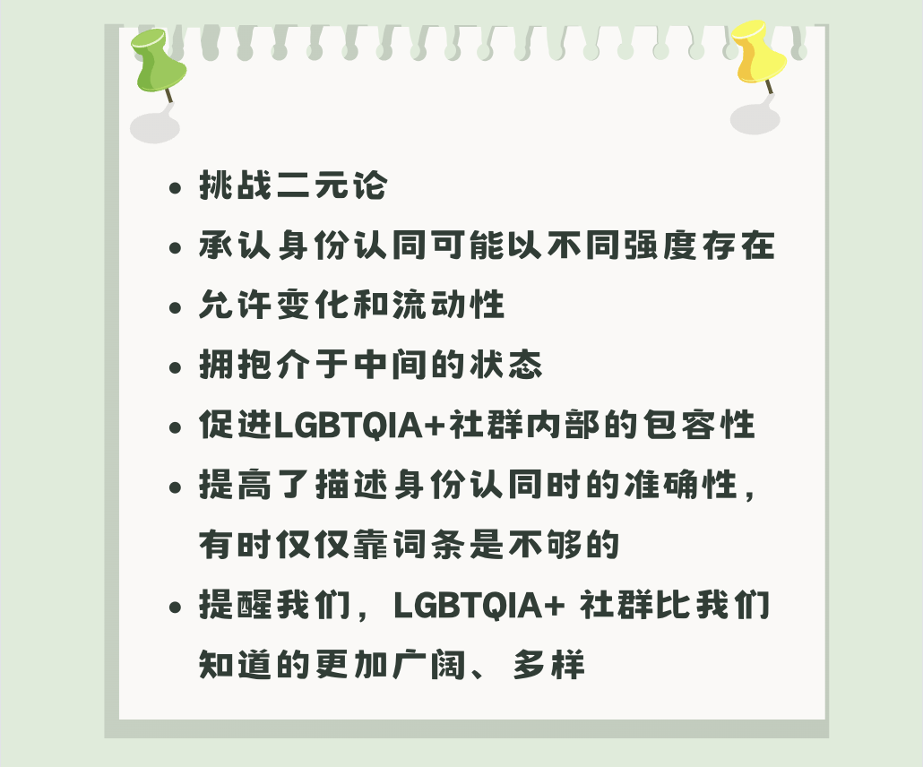 虽然这些模型并不完美,对人的身份过度简化,但它们的存在仍然影响了我们认识身份认同的方式。这里引用Ashley Mardell归纳的光谱模型的积极影响 [3] :