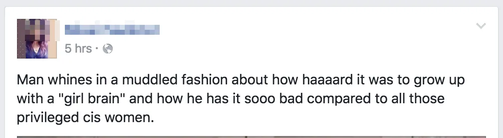 男人在一种愚蠢的流行趋势中抱怨关于带着一颗“女孩的头脑”成长有多——难,以及和那些有特权的顺女相比他过得有多——惨。