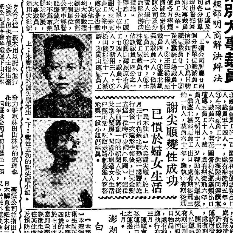 ** 谢尖顺 ** 是台湾史上第一位接受性别重置手术的人。谢尖顺是间性人,以男性身份生活到三十五岁,其本人曾表示不愿意接受性别重置手术切除男性性器官,1953年其因阑尾炎到医院就诊,医师认为从生理情况切除其正在恶化的男性性器官比依照其本人意愿更重要,报道写“牺牲个人幸福给医学做贡献”。这一手术事件当时在台湾社会引起空前反响,社会各界将其视为“台湾医学的伟大成就”,强调的是“台湾医学或赶上美国”。 ** [6][7] **