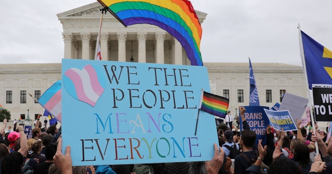 2020年,美国最高法院裁定《民权法案》中禁止性别歧视的规定同样适用于基于性倾向和性别认同的歧视。图为法院外集会的命中,标语内容为“WE THE PEOPLE MEANS EVERYONE”(“人民意味着每一个人”,“we the people”是美国宪法前言的前三个单词。)