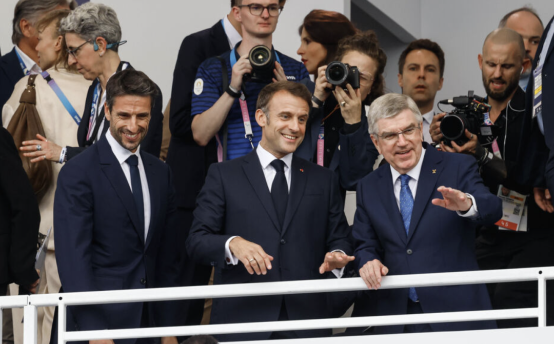 从左至右:巴黎2024奥组委主席Tony Estanguet、法国总统Emmanuel Macron、国际奥委会主席Thomas Bach © LP/Olivier Corsan