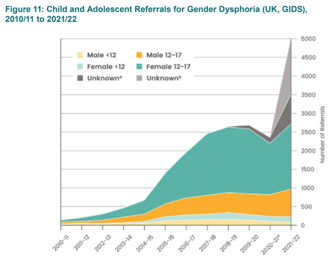 2009年,[GIDS] 仅接诊了不到 50 名儿童,其中大部分是男孩。而这一数字在 2022 年激增到近 5000 人,其中大部分是女孩。