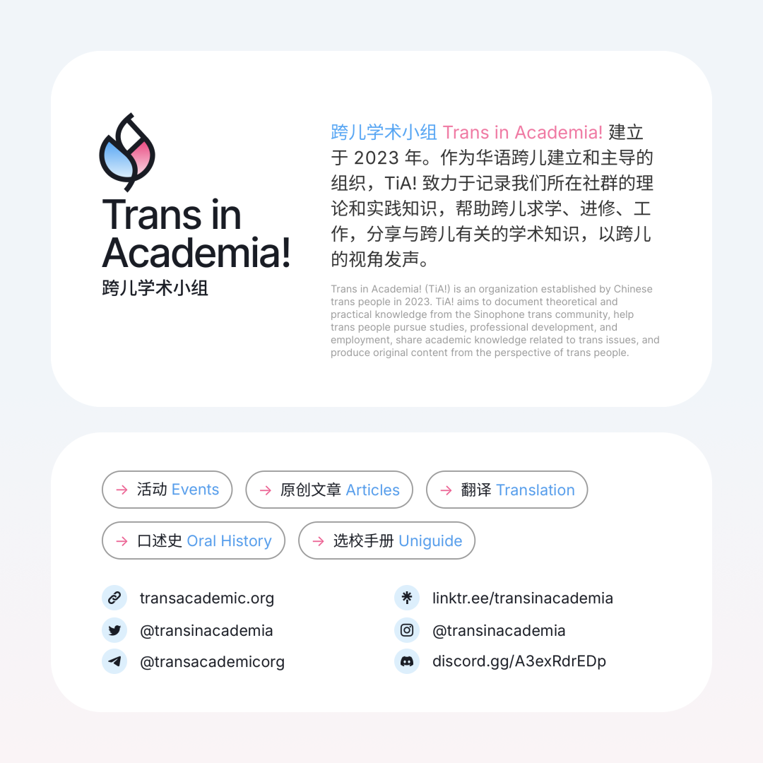 跨儿学术小组 Trans in Academia! 建立于 2023 年。作为由华语跨儿 / 跨性别者建立和主导的组织,跨儿学术小组致力于记录我们所在社群的理论和实践知识,帮助跨儿求学、进修、工作,分享与跨儿有关的学术动态,并以跨儿的视角发声。
