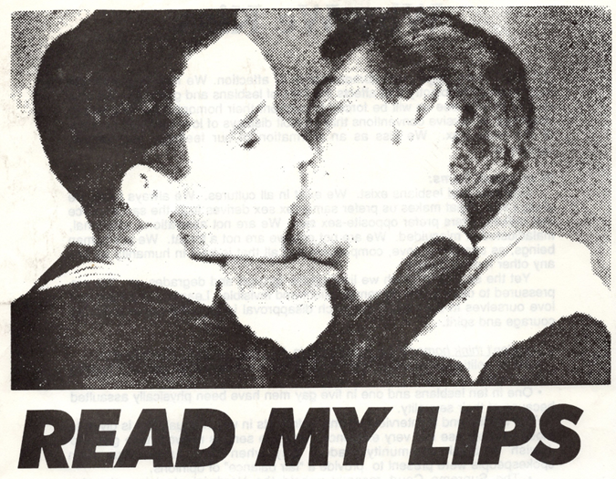图注:Gran Fury 是一个艺术和活动团体,与纽约艾滋病活动组织 ACT UP 关系密切,该组织制作了许多与该运动最相关的图像,以及艺术行动。Gran Fury 因盗用广告和流行文化中的图像和策略并重新部署它们来扰乱公共空间而闻名。这部作品的标题“看我口型(Read my lips)”挪用了乔治·布什 在竞选时承诺不会提高税收的名言,来对抗恐同。Gran Fury 在多个图像和上下文中使用了该文本和主题。