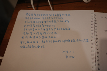女书店最让我动容的角落是几本厚厚的线圈本,上面有简体,有繁体,间或有一些华语圈之外的文字, 但是无一例外的,上面全都书写了美好的愿望与期许,对女孩们的祝福,对更平等世界的期盼。 翻阅这些或长或短的手信,我好像看见无数个ta们伏在这个小小的桌子前,这些美丽的字眼就这样流淌出来。