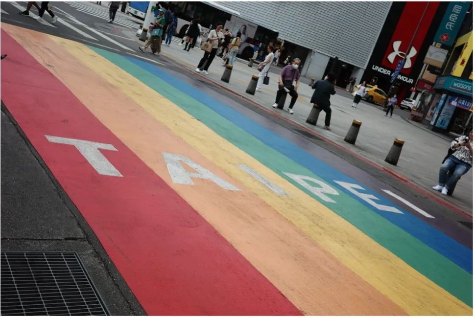 在人流攒动的西门町,刚一出地铁站便能看见马路上印着的六色彩虹, ** 昭示着台湾同性恋平权的成果,昭示着社会的包容与进步。 ** 一些店铺门口也挂着彩虹色的旗帜,或是陈列着六色彩虹的商品。