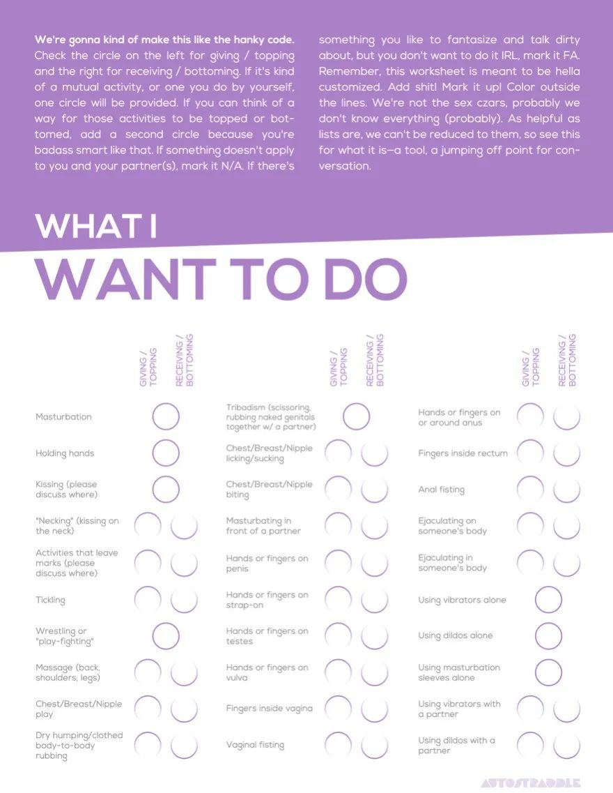 这一点不言而喻,但在卧室里(或任何地方)作出预设对任何人都没有好处。明确地表达你的需求和愿望非常重要。无论你是否有无障碍需求,知道自己想要什么都是成功的一半,所以不要害怕花点时间来探索自己真正的需求。像我们的Austen、Ara和Geneva之前制作的这类工作表,不仅能帮助你梳理自己的需求和愿望,还能让你和伴侣找到共同点。
