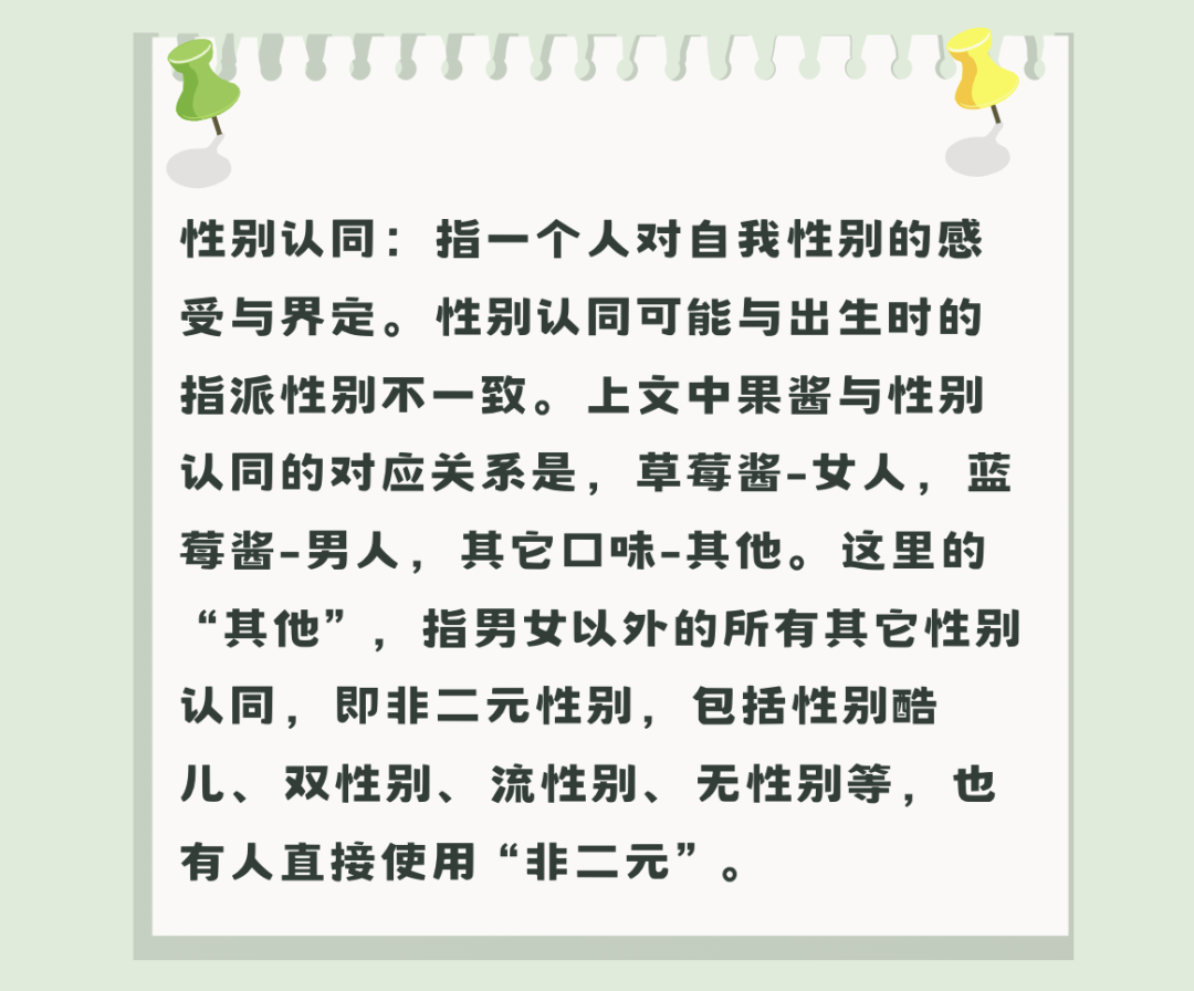 2.常见的性别姜饼人仍与“二元论”存在暧昧联系,光谱的轴线仍秉持男/女二分的尺度,不提供其Ta选项。一些人的身份认同和“男性”与“女性”毫无关联,二元分类的轴线对Ta们没有多大意义;而将Ta们多样化的身份认同统一归为到“其ta”,实际仍然语焉不详。