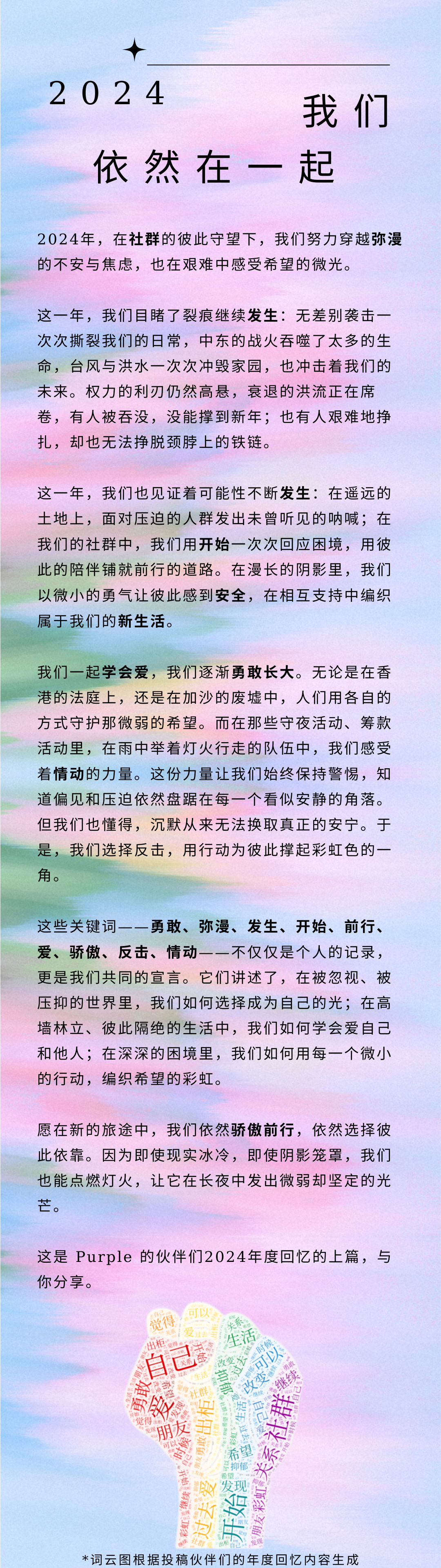 以上就是我在2024年最想要记录的事、最难忘的经历。我想要在此分享出来,希望能对大家有所激励与启发。过去我常常在想,作为性少数,我们就如同没有伞的孩子一样。那些顺直人、主流人能被父母、身边的同学朋友、老师乃至社会和国家爱着,而我们却一无所有,是被世界厌弃的存在……但现在,我想,与其陷入哀怨,抱怨命运与世界的不公,颓然地呆坐在原地,不如去远行,去追逐梦想,去跳出只属于自己的不被定义的舞蹈!自己的兴趣与热爱的事物,就如同一个避风港、后花园、固有结界,是自己唯一拥有的东西,也是残酷的世界永远也夺不走的。而当你不断努力,达成一个又一个有意义的目标(提升自己或帮助他人)时,你也会变得越来越强大与自由。最后,祝愿所有的社群同伴们都能找到自己的兴趣与热爱,勇敢追逐梦想,在新的一年越来越好!