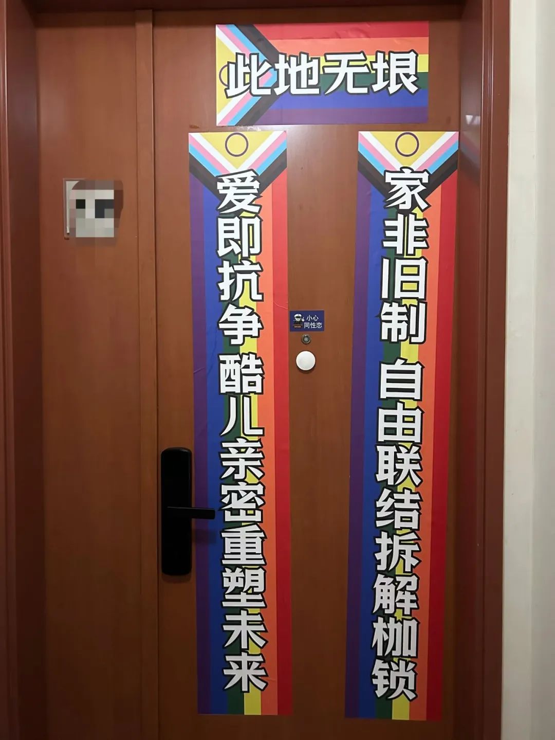 年底在家门口新贴的对联,内容是“上联:家非旧制 自由联结拆解枷锁;下联:爱即抗争 酷儿亲密重塑未来。横批:此地无垠”。