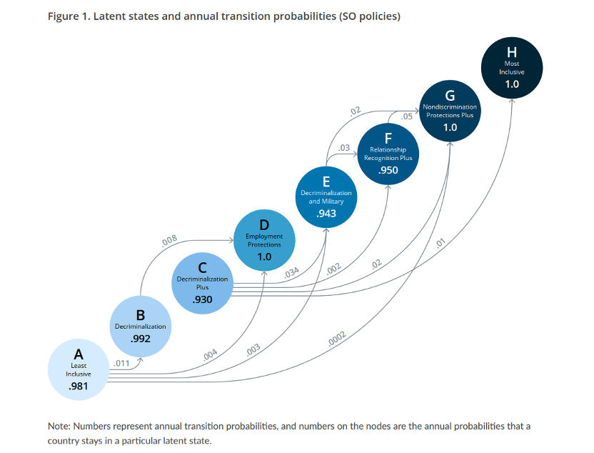研究发现, 社会接纳度是推动LGBTI法律保护的重要基础。 在政策发展路径上,研究团队发现,对性取向的保护通常始于同性恋去罪化,随后是就业保护或更广泛的反歧视保护;对性别认同与表达、性征的保护最可能始于允许变更性别标记并建立正式的性别认同法律程序或医疗保护;更广泛的基于性别认同和表达的反歧视保护可能是下一步的政策发展。