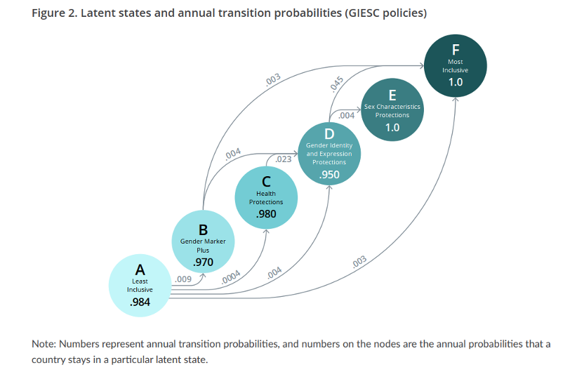 在具体的政策发展路径方面,研究通过隐马尔可夫模型揭示了一些典型模式。SO保护通常始于非刑罪化,随后扩展到就业保护,最终发展为全面的反歧视保护体系。而GIESC保护则往往从允许性别标记变更开始,逐步建立起性别认可程序,并最终发展出全面的反歧视保护框架。这些路径虽非唯一选择,但为各国提供了有益的参考。各国在发展GIESC政策时并非都经历每个潜在状态,但通常是从允许性别标记变更到确保医疗保健中的反歧视保护的渐进式包容性发展。