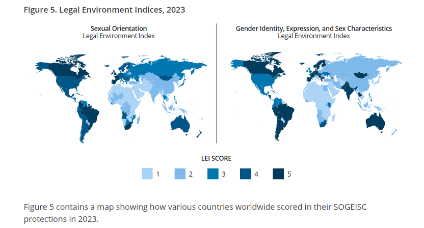 数据显示,过去33年间,全球LGBTI权益保护总体呈现积极发展态势。在SO方面,最不包容的国家比例从1990年的57%下降到2023年的30%;在GIESC方面,这一比例从90%降至51%。尽管各国发展程度不一,但整体趋势是向着更加包容和平等的方向发展。