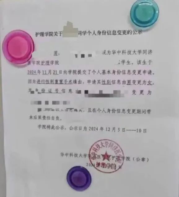 华中科技大学同济医学院护理学院一名学生因进行性别重置手术,向学院提交性别信息由“男”变更为“女”的申请,学院发布了盖有公章的公示,并写明学生姓名、专业班级、身份证号码等信息。公示期为2024年12月5日至10日。学院办公室相关负责人称有相关部门和程序,但不清楚具体情况。