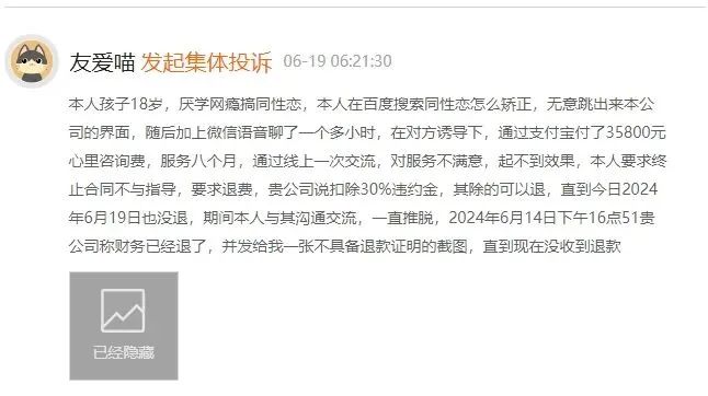 2024年8月,社群媒体“同志之声”报道, 陕西艾尚阳光心理咨询公司以“治疗”性少数为业,在全国多地注册多家公司,在百度投放广告 。当家长搜索相关关键词时,其广告会出现,家长以为咨询的是各地机构,实则咨询微信都指向陕西艾尚。陕西艾尚不仅在百度,还在其他平台做内容运营,自称成立“性倾向扭转治疗研究院”。其提供两种“扭转方式”,一种是30万起的一对一上门扭转治疗,另一种是45800元的在线扭转,不成功全额退款,成功标准是能跟异性交往。有家长在黑猫投诉该公司欺诈,损失数万元。此外,百度为这类公司提供平台和流量,定制广告内容,遍布搜索页面,难以区分。