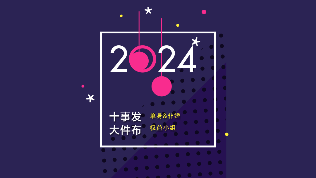 前段时间后台收到网友发来的来信,问道:“后续还会更新吗?”答案是:更新!尽管小组成员忙于各自的生活和工作,我们还是在年底启动了“单身- 非婚10大事件”评选工作。如今女权议题虽引起广泛关注,但缺乏深入的讨论,单身/非婚群体的权益因其边缘性更需持续发声。经过多轮研讨,我们从最初提名的26个事件中筛选出了2024年10大事件。