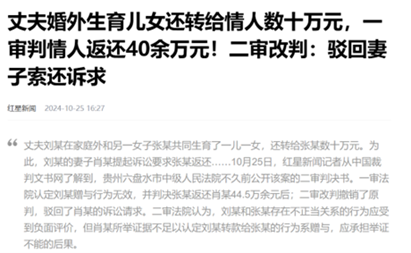 据红星新闻2024年10月25日的报道,中国裁判文书网不久前公开一份判决书,贵州男子刘某和肖某婚后,又与张某生育一儿一女。肖某因丈夫刘某向张某转账提起诉讼,索还42万余元,庭审中又变更为52万元。法院一审认定张某从刘某处取得的财产属夫妻共同财产,违背社会公序良俗,判决张某返还44.5万余元,张某不服提起上诉。六盘水中院二审认为,刘某与张某之间存在不正当关系,应受到负面评价,但具体到本案款项是否返还,根据现有证据可认定刘某与张某共同生育两个孩子,且刘某承认所涉款项有其自己使用的部分,还有生育孩子及孩子生病治疗的费用,而刘某需对孩子承担抚养义务,故不足以认定刘某向张某转款的行为系赠与。据此六盘水中院作出二审判决:撤销原判,驳回肖某的诉讼请求。