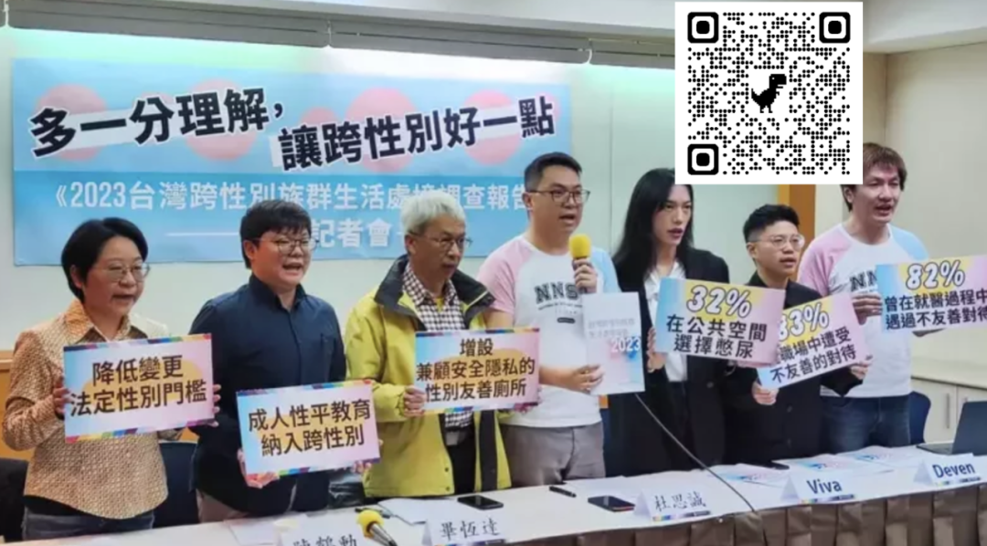 为了解台湾跨性别社群在“日常生活”、“职场经验”、“就医经验”等三个面向的处境,台湾同志咨询热线协会自2022年至2023年完成三场焦点团体与一份网路问卷调查,收集832位有效样本,完成“2023台湾跨性别族群生活处境报告”。调查显示有32%跨性别者担心在公共厕所遭受质疑、打量,出门在外宁可憋尿,而从未在职场中遭受不友善对待的跨性别社群,则不到2成。