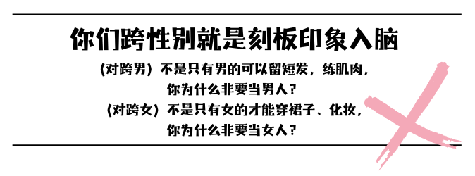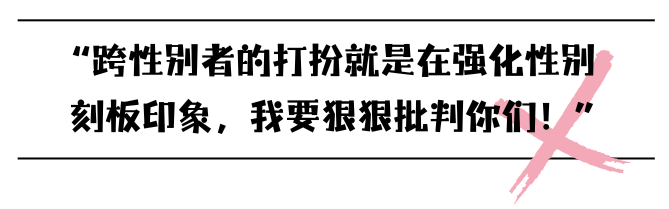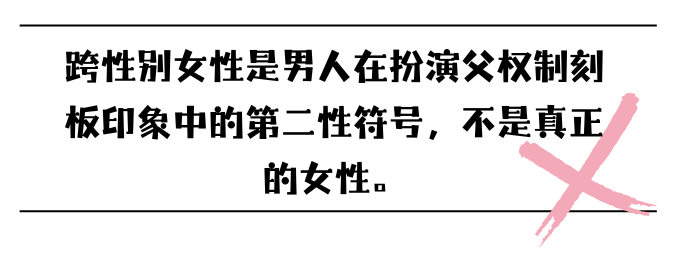 *当然,性别表达女性化/阴柔的跨女也不应该被指责强化刻板印象或扮演所谓“女性符号”。原因详见本文针对言论一的怼怼。
