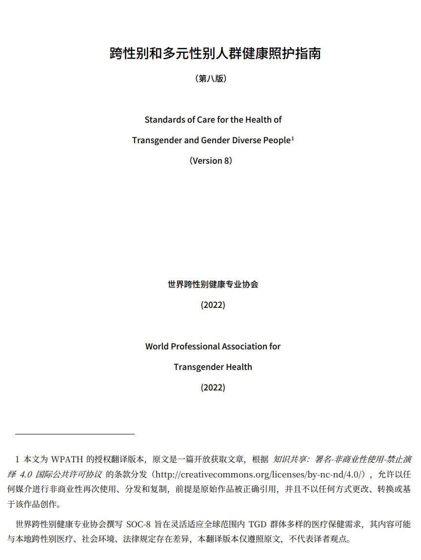 【1】译注:由于 “care” 在英文中本身涵涵多重含义,中文社群目前对 “gender affirming care” 的翻译尚未完全统一,常见用法包括“性别肯定护理”“性别肯定照护”“性别肯定医疗”“性别肯定医疗照护”“性别肯定健康照护”等。本文综合参照了国内社群的不同译法, 也兼顾表述的流畅度,最终采用“性别肯定照护”作为统一译名,意在强调对跨性别个体身心需求的回应与支持,同时兼顾医疗需求、日常照料、管束限制的多重面向。由于具体语境中对“care”的意义的侧重有所不同,在实际使用时仍可能存在不同说法。